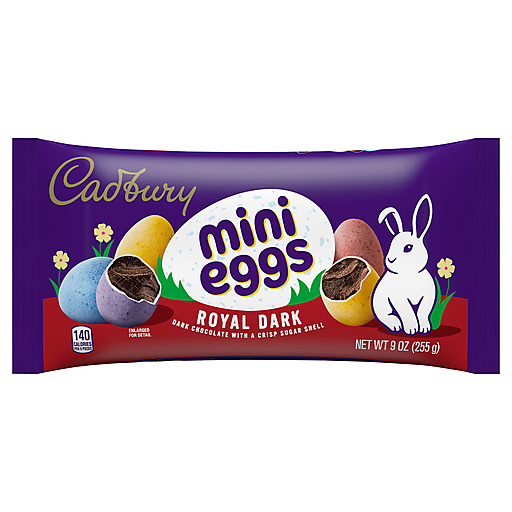 Hop into deliciousness with these delectable dark chocolate candies with crisp sugar shells! The search for the perfect Easter candy is over. CADBURY MINI EGGS Royal Dark chocolate candy is treat you'll want to enjoy by the handful. These dark chocolate eggs are coated with crisp sugar shells finished in playful pastel colors, making them the perfect addition to Easter baskets, candy bowls and seasonal decor. These treats make it easy to fill lunch boxes, snack cabinets and movie night snack selections with yummy pastel colored candy everyone will love. Fill your Easter baskets and plastic eggs with small bags of these dark chocolate candies to treat yourself and those closest to you with a delectable crunchy, smooth candy. Looking for a grand prize for your Easter egg hunt? Offer up a bag of CADBURY dark chocolate candy. No one involved in the hunt will want to stop searching once they find out what the delicious prize is. If you want to mix it up even more this spring, try giving your favorite brownies, cupcakes, cookies or pies a bit of a crunch by topping them with premium chocolate eggs candy. Let cool, serve to loved ones and wait for the recipe requests to pour in!