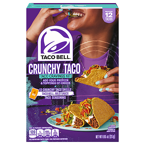 Live más at home with our Taco Bell Crunchy Taco Cravings Kit. Taco Bell makes mealtime more craveable with our dinner kit that contains 12 crunchy taco shells, Taco Bell Mild Sauce and taco seasoning. Add your protein and toppings of choice for an easy-to-make dinner your whole family will enjoy. To prepare, cook your protein in a skillet, add the seasoning mix with 3/4 cup of water, bring to a boil and simmer for 10 minutes. Meanwhile, bake taco shells on a baking sheet in the oven at 300°F for 3-5 minutes. Let everyone customize their tacos with Taco Bell Mild Sauce, cheese, sour cream, salsa, shredded lettuce, tomatoes and more. Each kit makes 12 tacos. Live more fervently, more authentically, more joyfully with Taco Bell.