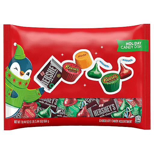 This holiday season, skip the plain candy and fill your stockings, candy dishes and gift baskets with treats dressed for the occasion. This delicious bag of Hershey's candy contains an assortment of REESE'S Miniatures milk chocolate peanut butter cups, ROLO® creamy caramels wrapped in rich chocolate candy, HERSHEY'S KISSES milk chocolate candy and HERSHEY'S Miniatures assortment candy — all in festive holiday packaging. Grab a handful of assorted candies and stuff them in stockings, arrange them in your beautiful gift baskets, or better yet, hide them in your Christmas tree for your little ones to find! Everyone will get the chance to indulge in a chocolate candy without missing a delicious bite. This bag of Hershey's holiday candy is the perfect go-to supply when you need to top up candy bowls, spread a bit of cheer during holiday parties or when you need a few sweet treats for movie nights and yourself. If you enjoy baking, add some of these candies to your favorite recipes or simply put them out for dessert. Celebrate with Hershey's Christmas candy and enjoy special moments with your loved ones.